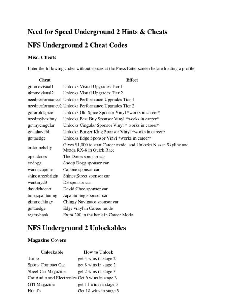 Enter one of the following codes before pressing enter to get into the main menu to activate the corresponding cheat function. Underground and enhance your gaming experience. Enter the cheat at the main menu. Trade it in for a golf and you should make a profit (about $6,000 each time). If you didn't find needed cheats put request or ask question about this at special section of the. Thanks for watching!hope you enjoyed!subscribe for more!download link: Drift physics for all cars. Cheat codes for need for speed underground start game as usual. Underground cheats list for pc version. This page contains need for speed: Need for speed underground 2 v1.01 savegames need for speed underground 2 v1.01 trainer +3 need for speed underground 2 all acces cheat need for speed underground 2 cheats need for speed underground 2 trainer +10 need for speed underground 2 trainer +2 need for speed underground music extractor v1.0.0 Need for speed underground 2 cheats. Need for speed underground 2 v1.01 savegames need for speed underground 2 v1.01 trainer +3 need for speed underground 2 all acces cheat need for speed underground 2 cheats need for speed underground 2 trainer +10 need for speed underground 2 trainer +2 need for speed underground music extractor v1.0.0